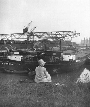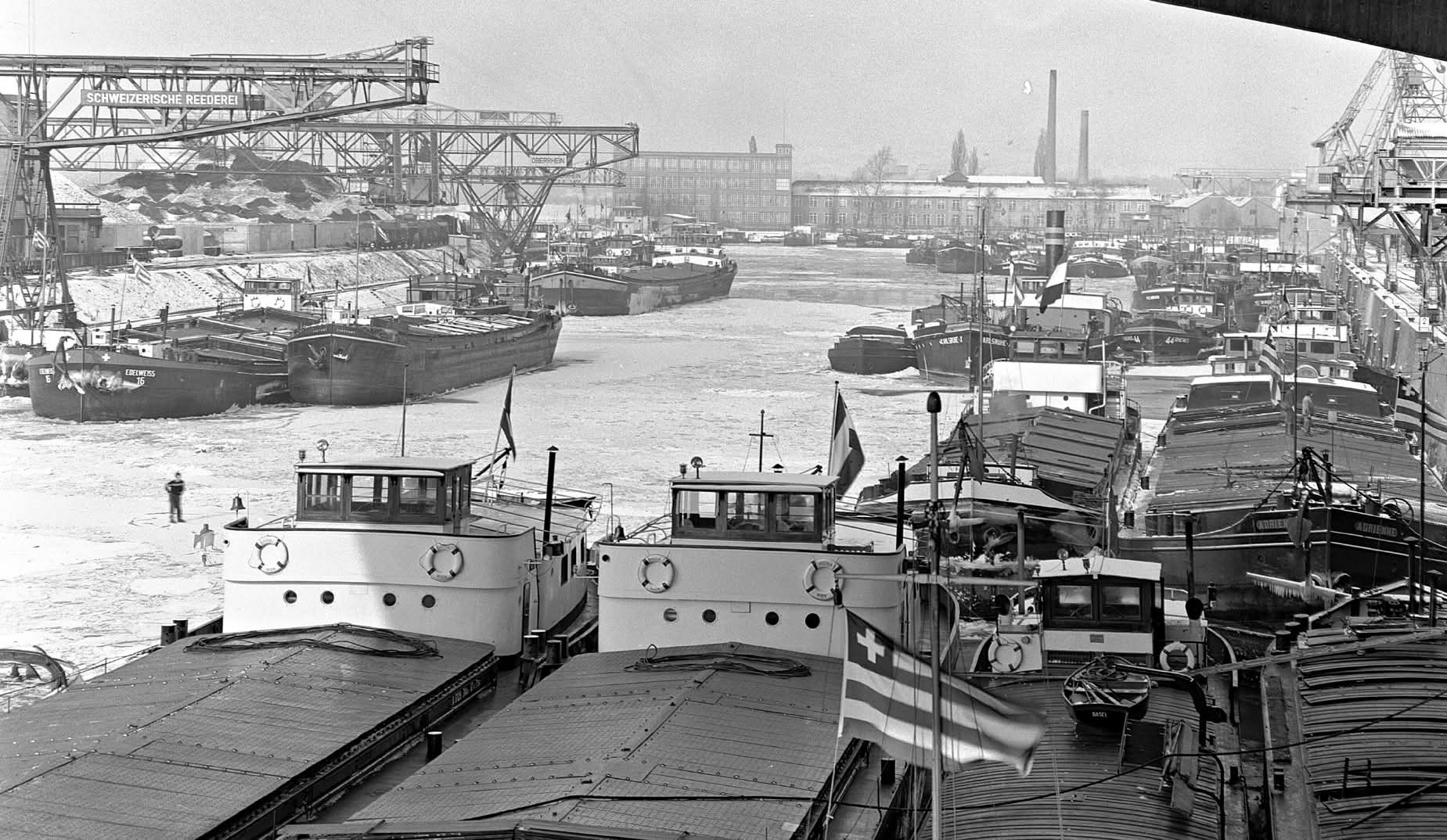 So präsentierte sich das Kleinhüninger Hafenbecken II am 29. Oktober 1975, rund 30 Jahre nach seiner Inbetriebnahme. Der erste Basler Rheinhafen war der 1911 eröffnete Industriehafen St. Johann. Die Planungen für die Hafenanlage in Kleinhüningen begannen 1914, ihr Initiator war der Ingenieur Rudolf Gelpke. 1922 nahm das erste Hafenbecken seinen Betrieb auf. Das zweite Hafenbecken wurde von 1936 bis 1939 im Rahmen des ‹Basler Arbeitsrappens› angelegt und nach dem Ende des Zweiten Weltkriegs offiziell eröffnet. Parallel dazu entstanden die Häfen in Birsfelden und Muttenz. (Bildquelle: Staatsarchiv Basel-Stadt, Foto: Hans Bertolf, BSL 1013 1-6981 1)