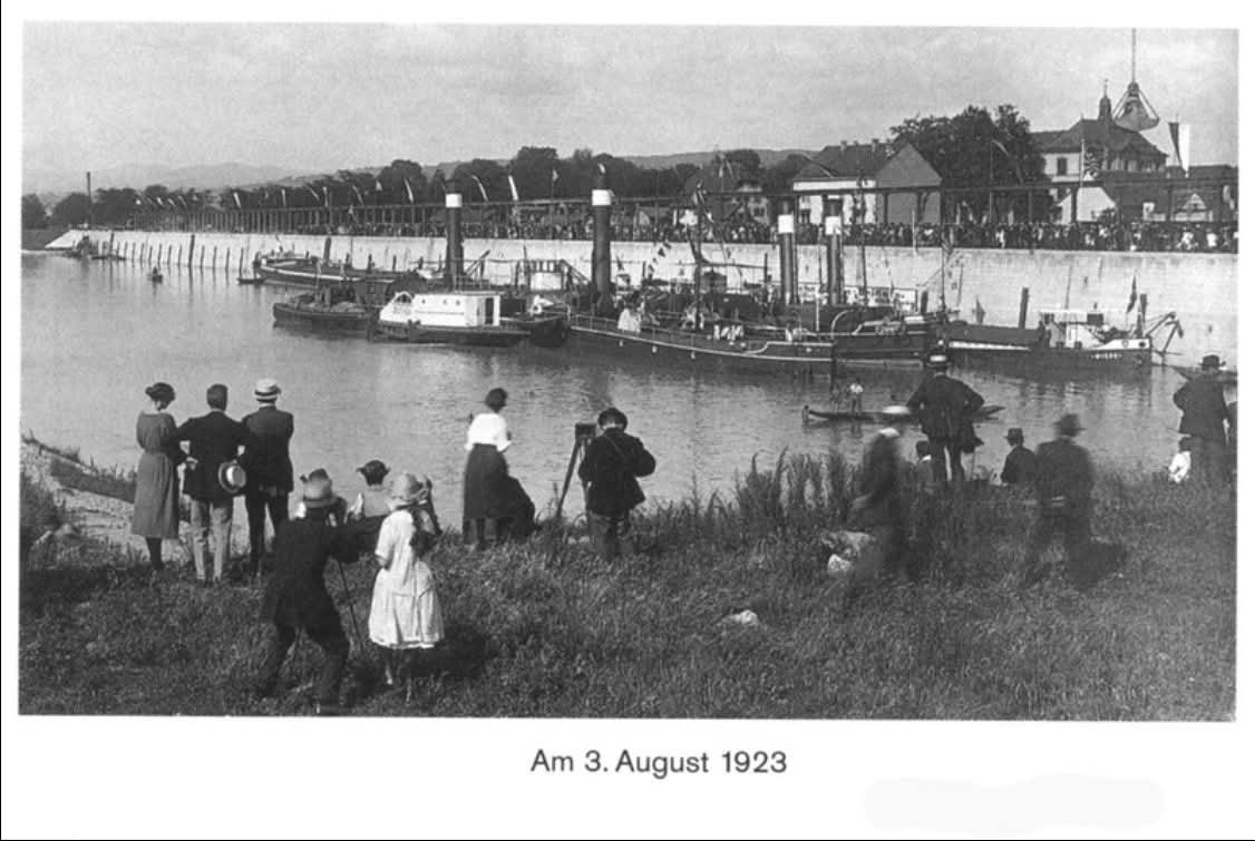 Bomben auf Kembs und der Rheinhafen ohne Wasser am 7. Oktober 1944: «Mehrere Staffeln englischer Bomber greifen das Stauwerk Kembs unterhalb Basels mit Sechstonnen-Bomben an. Eine grössere Anzahl Explosionen, zum Teil von Zeitbomben herrührend, erschüttern die Luft so sehr, dass an einigen Stellen Basels die Scheiben in Brüche gehen. Infolge der Sprengung von Schützen am Stauwehr fliesst ein Teil des gestauten Rheinwassers ab; in Basel fällt der Rheinpegel im Verlauf von drei Stunden um beinahe drei Meter, so dass die im Kleinhüninger Hafenbecken II liegenden Schiffe raschestens abgeschleppt werden müssen.» (Basler Chronik) Das Foto von Hans Bertolf zeigt die MS Nidwalden, die – mit 18 weiteren Schiffen – im Hafenbecken II auf Grund liegt. Als Folge der Kriegseinwirkungen wurde im Oktober 1944 die Rheinschifffahrt eingestellt und erst im April 1946 wieder aufgenommen. (Bildquelle: Staatsarchiv Basel-Stadt, BSL 1060c 3/2/511)Das Stauwerk ist für die Schifffahrt in Basel von grosser Bedeutung: «Die Stauwirkung reicht bis oberhalb des Stadtgebietes von Basel. In den Hafenanlagen wurde die Wassertiefe durch den Stau um etwa 3 bis 4 m erhöht. Die seit der Inbetriebnahme des Kraftwerkes Kembs 1933 neu erstellten Hafenanlagen wurden auf das Vorhandensein des Kembser Staues ausgerichtet.» Das Hafenbecken I, der Klybeckquai und der Industriehafen St. Johann konnten ihren Betrieb auch bei niedrigem Pegel aufrechterhalten.