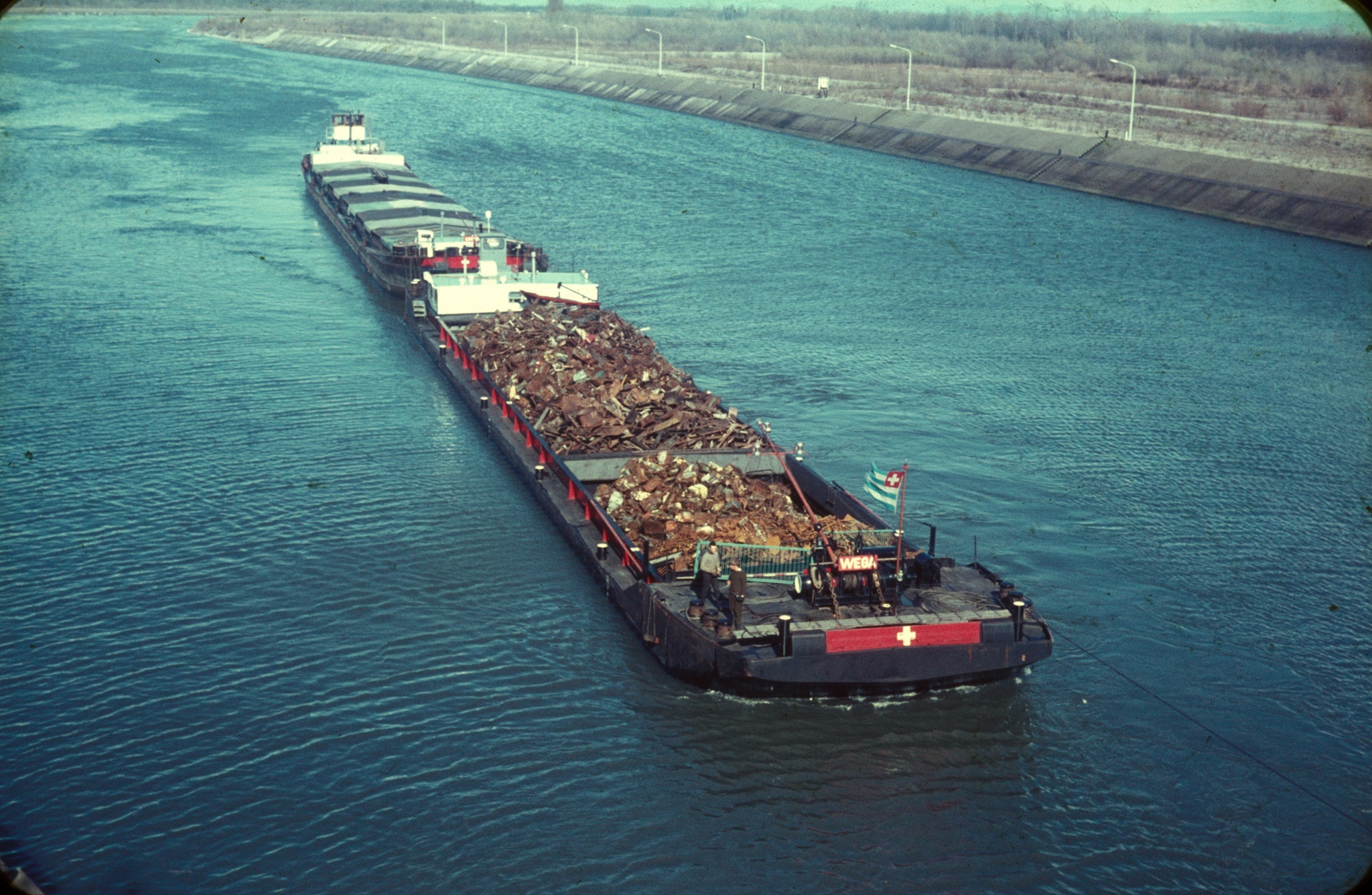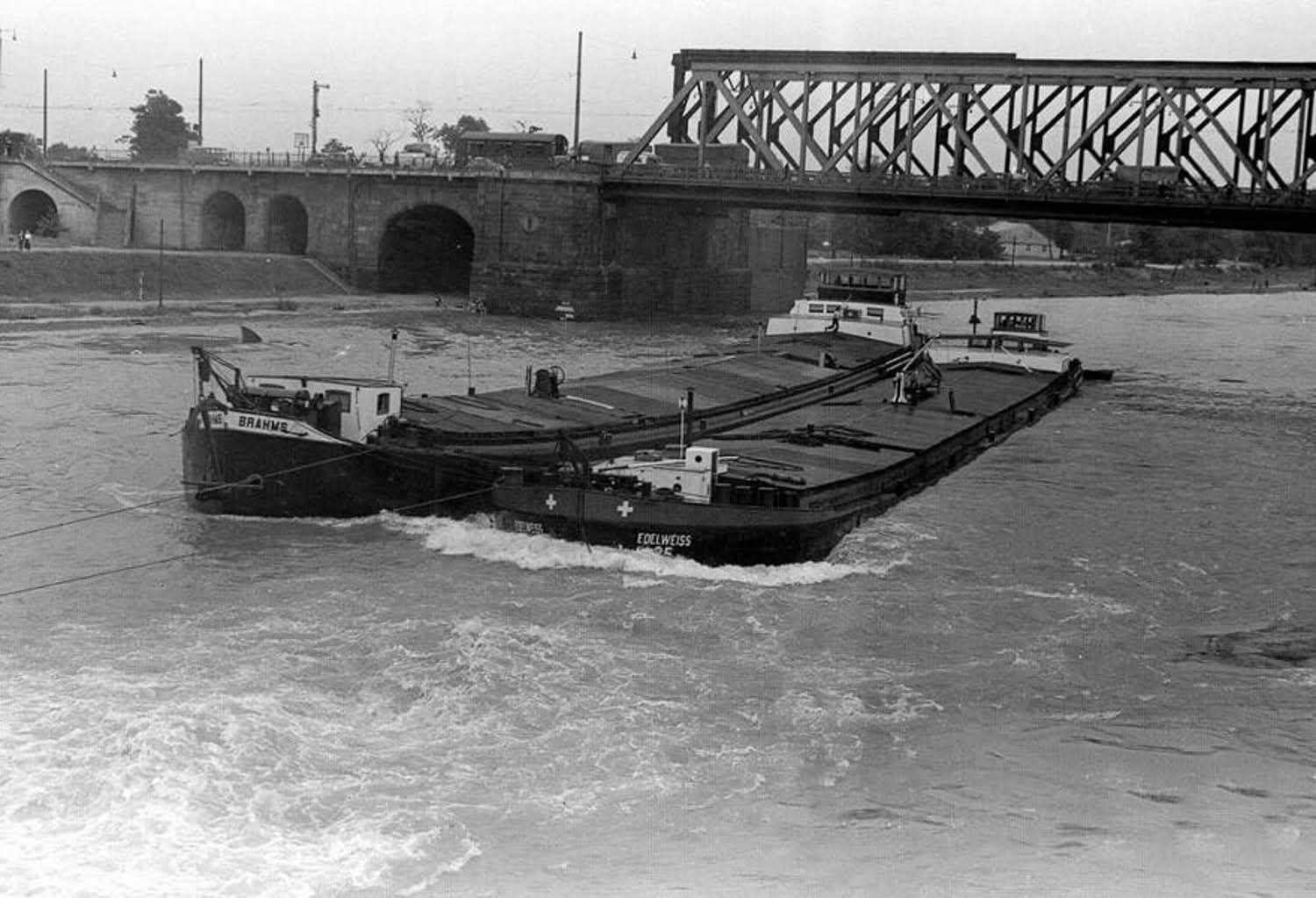 2 "Leberwürste" hinter der Boot Fatima 1965 auf der Bergfahrt bei Chalampé. Backbord Edelweiss21 mit Gemma, Steuerbord Edelweiss25 mit Columba. Woher ich das weiss? Von der Bildunterschrift. Fotograph war Peter Moeschlin, Basel. Die Wäscheaufhängende oder -abnehmede Frau, ist die Frau vom Schiffsführer Jan van Neijenhoff.
