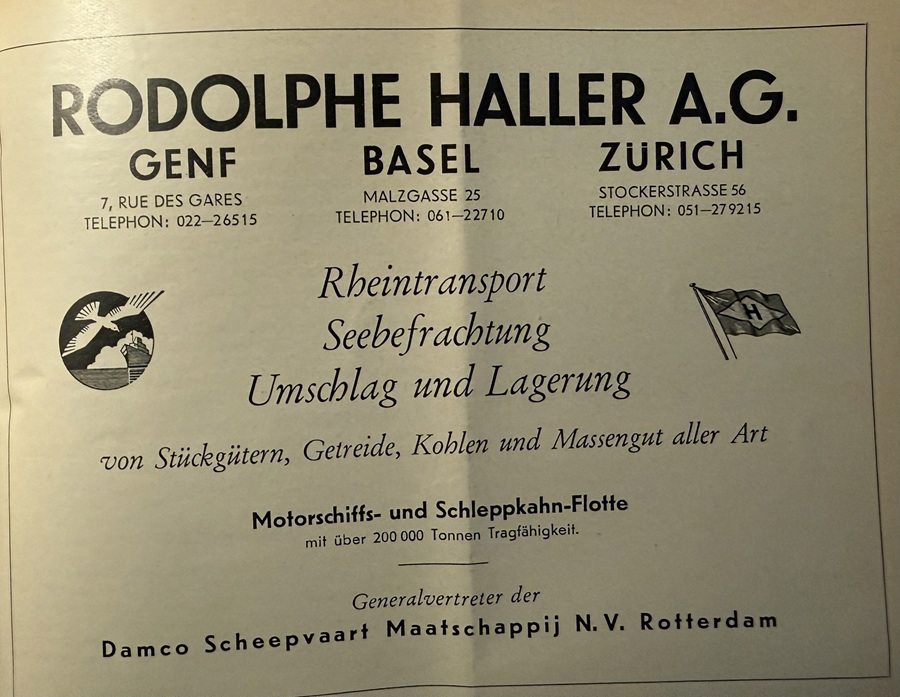 Am 1. Juni 1954 wurde die Speditionsfirma Rodolphe Haller AG, Genf aufgekauft, die 7 Gütermotorschiffe im Besitz hatte. Die Flotte wurde jetzt unter dem Namen Rheinreederei Zürich AG weiterbetrieben. Anfänglich wurde die Rheinreederei in den bestehenden, alten Büros der Haller AG an der Malzgasse 7 in Basel weiterbetrieben.