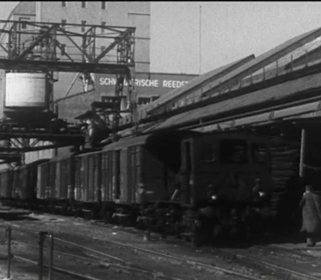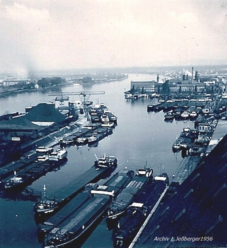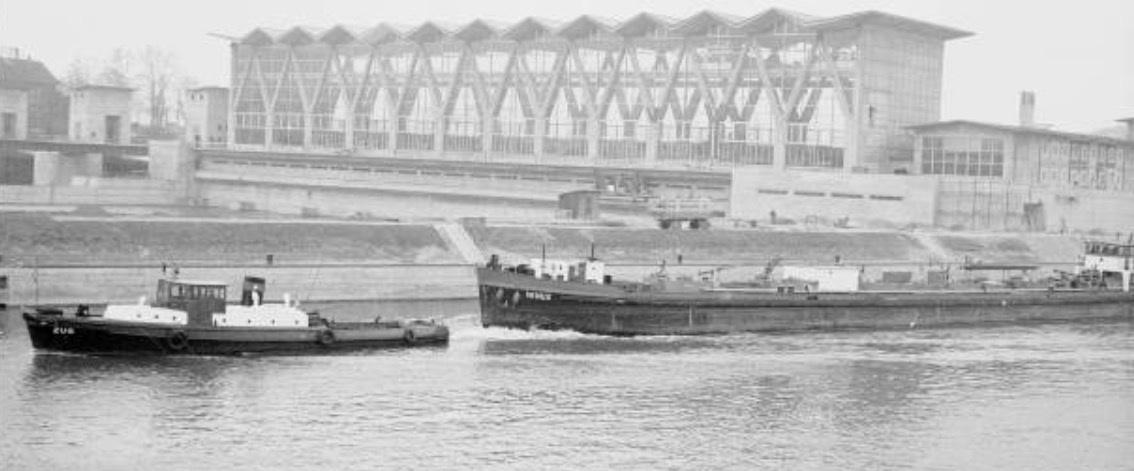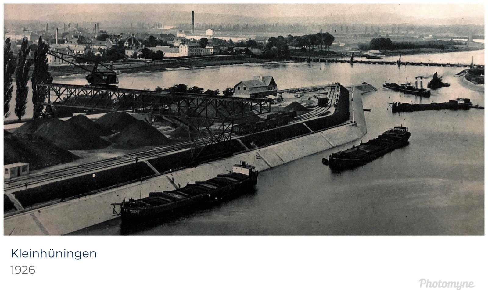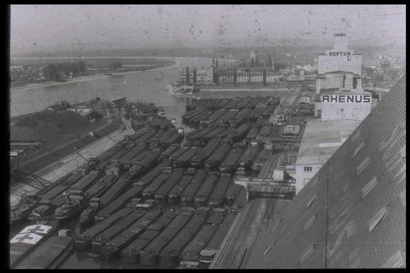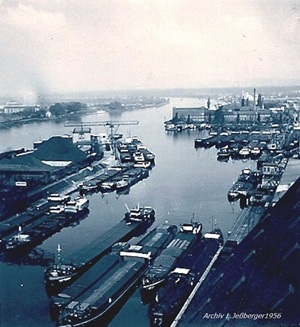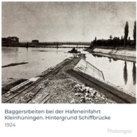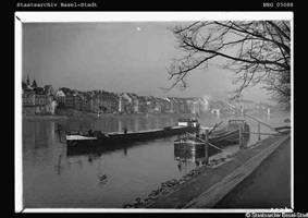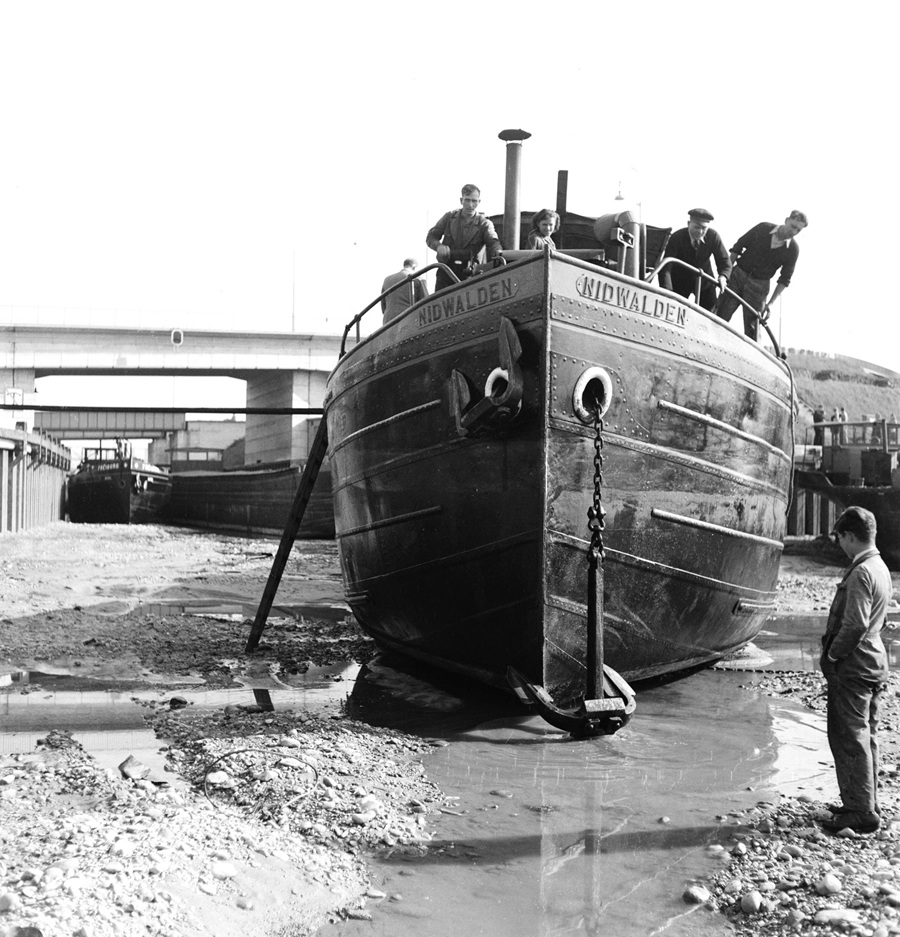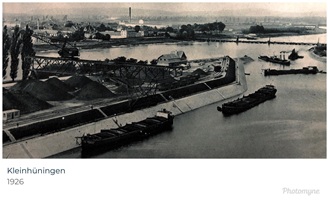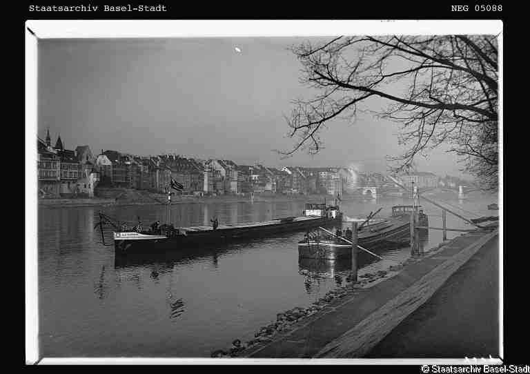 Bomben auf Kembs und der Rheinhafen ohne Wasser am 7. Oktober 1944: «Mehrere Staffeln englischer Bomber greifen das Stauwerk Kembs unterhalb Basels mit Sechstonnen-Bomben an. Eine grössere Anzahl Explosionen, zum Teil von Zeitbomben herrührend, erschüttern die Luft so sehr, dass an einigen Stellen Basels die Scheiben in Brüche gehen. Infolge der Sprengung von Schützen am Stauwehr fliesst ein Teil des gestauten Rheinwassers ab; in Basel fällt der Rheinpegel im Verlauf von drei Stunden um beinahe drei Meter, so dass die im Kleinhüninger Hafenbecken II liegenden Schiffe raschestens abgeschleppt werden müssen.» (Basler Chronik) Das Foto von Hans Bertolf zeigt die MS Nidwalden, die – mit 18 weiteren Schiffen – im Hafenbecken II auf Grund liegt. Als Folge der Kriegseinwirkungen wurde im Oktober 1944 die Rheinschifffahrt eingestellt und erst im April 1946 wieder aufgenommen. (Bildquelle: Staatsarchiv Basel-Stadt, BSL 1060c 3/2/511)Das Stauwerk ist für die Schifffahrt in Basel von grosser Bedeutung: «Die Stauwirkung reicht bis oberhalb des Stadtgebietes von Basel. In den Hafenanlagen wurde die Wassertiefe durch den Stau um etwa 3 bis 4 m erhöht. Die seit der Inbetriebnahme des Kraftwerkes Kembs 1933 neu erstellten Hafenanlagen wurden auf das Vorhandensein des Kembser Staues ausgerichtet.» Das Hafenbecken I, der Klybeckquai und der Industriehafen St. Johann konnten ihren Betrieb auch bei niedrigem Pegel aufrechterhalten.