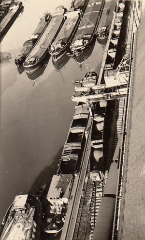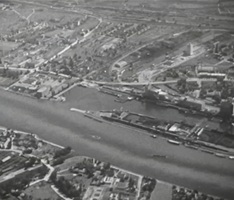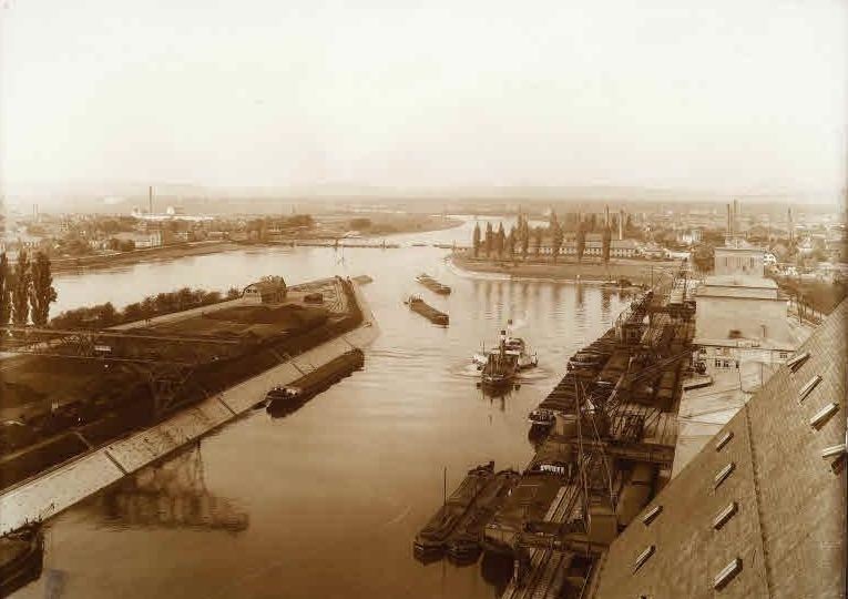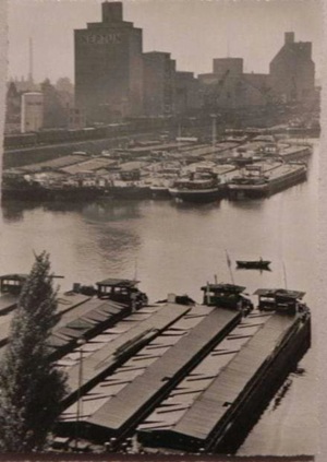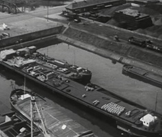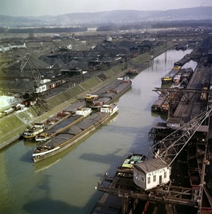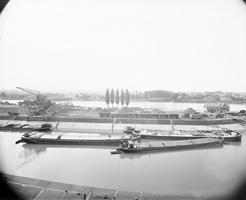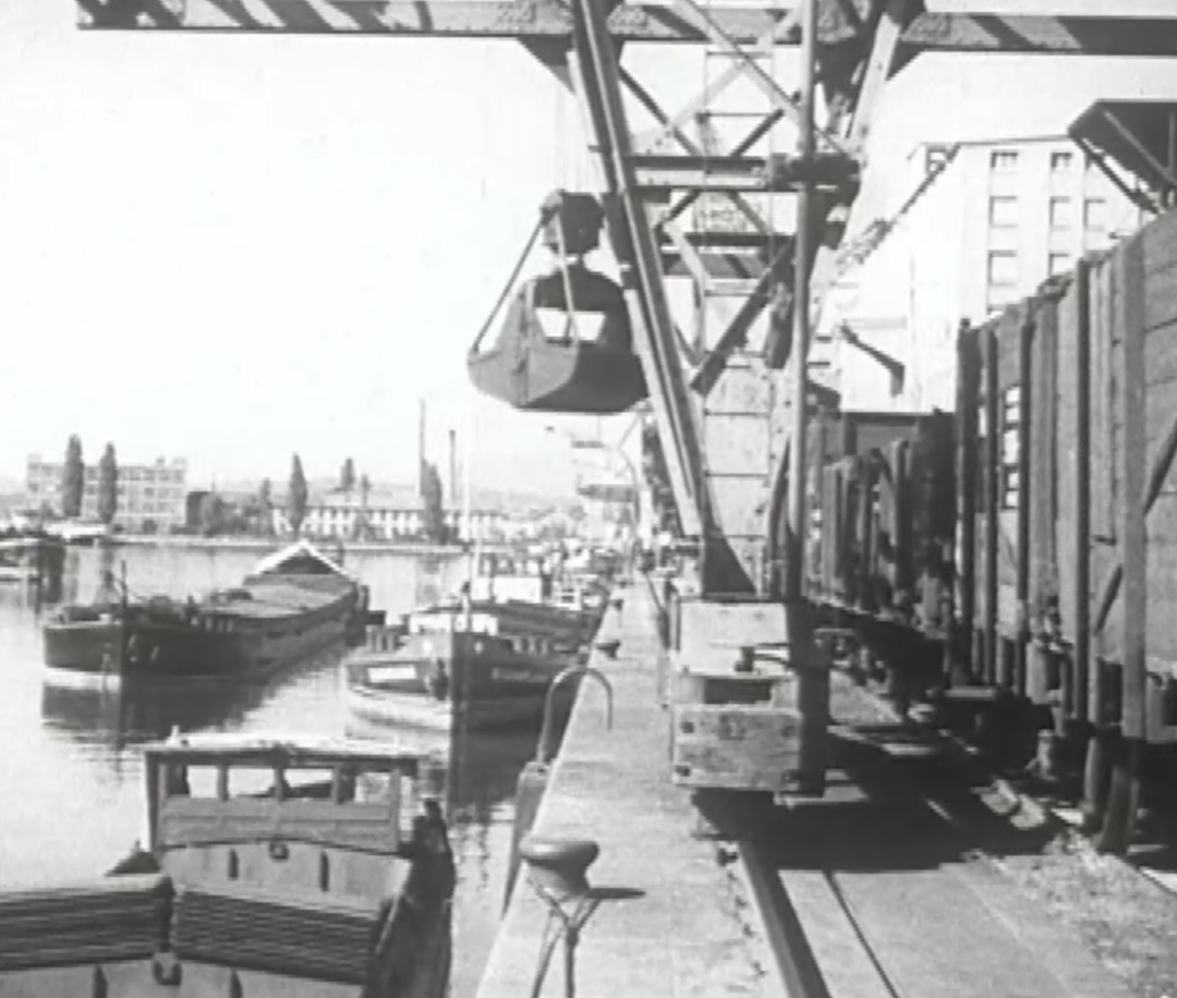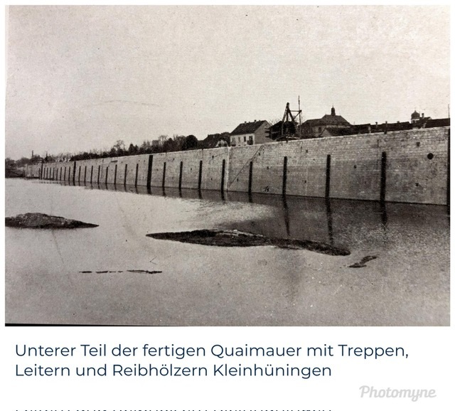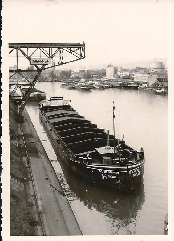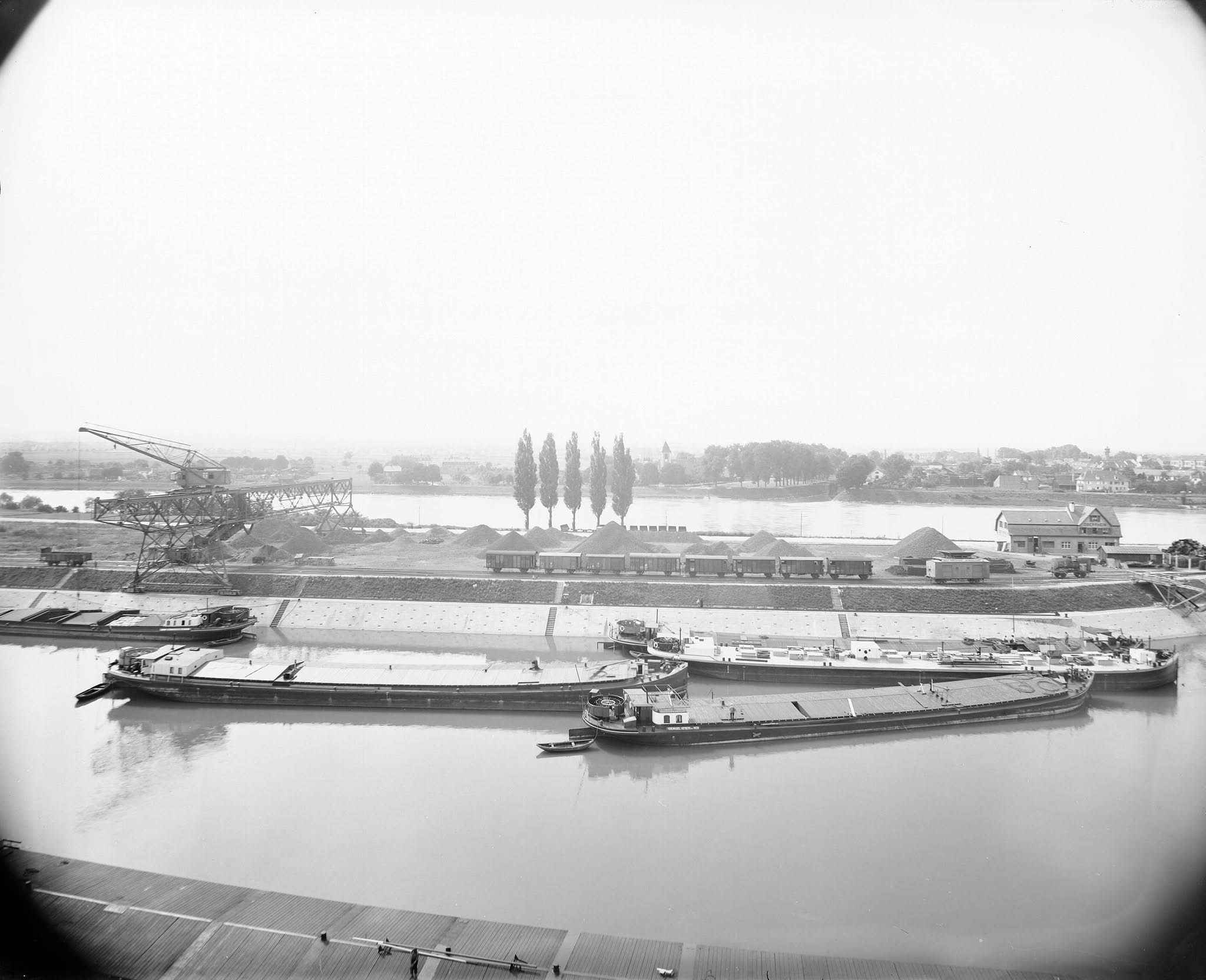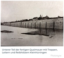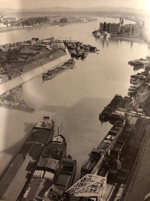 Bomben auf Kembs und der Rheinhafen ohne Wasser am 7. Oktober 1944: «Mehrere Staffeln englischer Bomber greifen das Stauwerk Kembs unterhalb Basels mit Sechstonnen-Bomben an. Eine grössere Anzahl Explosionen, zum Teil von Zeitbomben herrührend, erschüttern die Luft so sehr, dass an einigen Stellen Basels die Scheiben in Brüche gehen. Infolge der Sprengung von Schützen am Stauwehr fliesst ein Teil des gestauten Rheinwassers ab; in Basel fällt der Rheinpegel im Verlauf von drei Stunden um beinahe drei Meter, so dass die im Kleinhüninger Hafenbecken II liegenden Schiffe raschestens abgeschleppt werden müssen.» (Basler Chronik) Das Foto von Hans Bertolf zeigt die MS Nidwalden, die – mit 18 weiteren Schiffen – im Hafenbecken II auf Grund liegt. Als Folge der Kriegseinwirkungen wurde im Oktober 1944 die Rheinschifffahrt eingestellt und erst im April 1946 wieder aufgenommen. (Bildquelle: Staatsarchiv Basel-Stadt, BSL 1060c 3/2/511)Das Stauwerk ist für die Schifffahrt in Basel von grosser Bedeutung: «Die Stauwirkung reicht bis oberhalb des Stadtgebietes von Basel. In den Hafenanlagen wurde die Wassertiefe durch den Stau um etwa 3 bis 4 m erhöht. Die seit der Inbetriebnahme des Kraftwerkes Kembs 1933 neu erstellten Hafenanlagen wurden auf das Vorhandensein des Kembser Staues ausgerichtet.» Das Hafenbecken I, der Klybeckquai und der Industriehafen St. Johann konnten ihren Betrieb auch bei niedrigem Pegel aufrechterhalten.