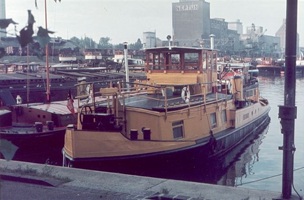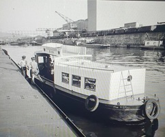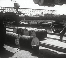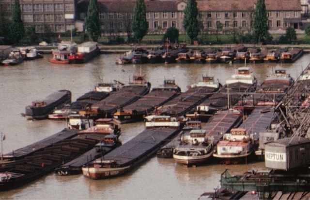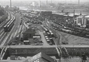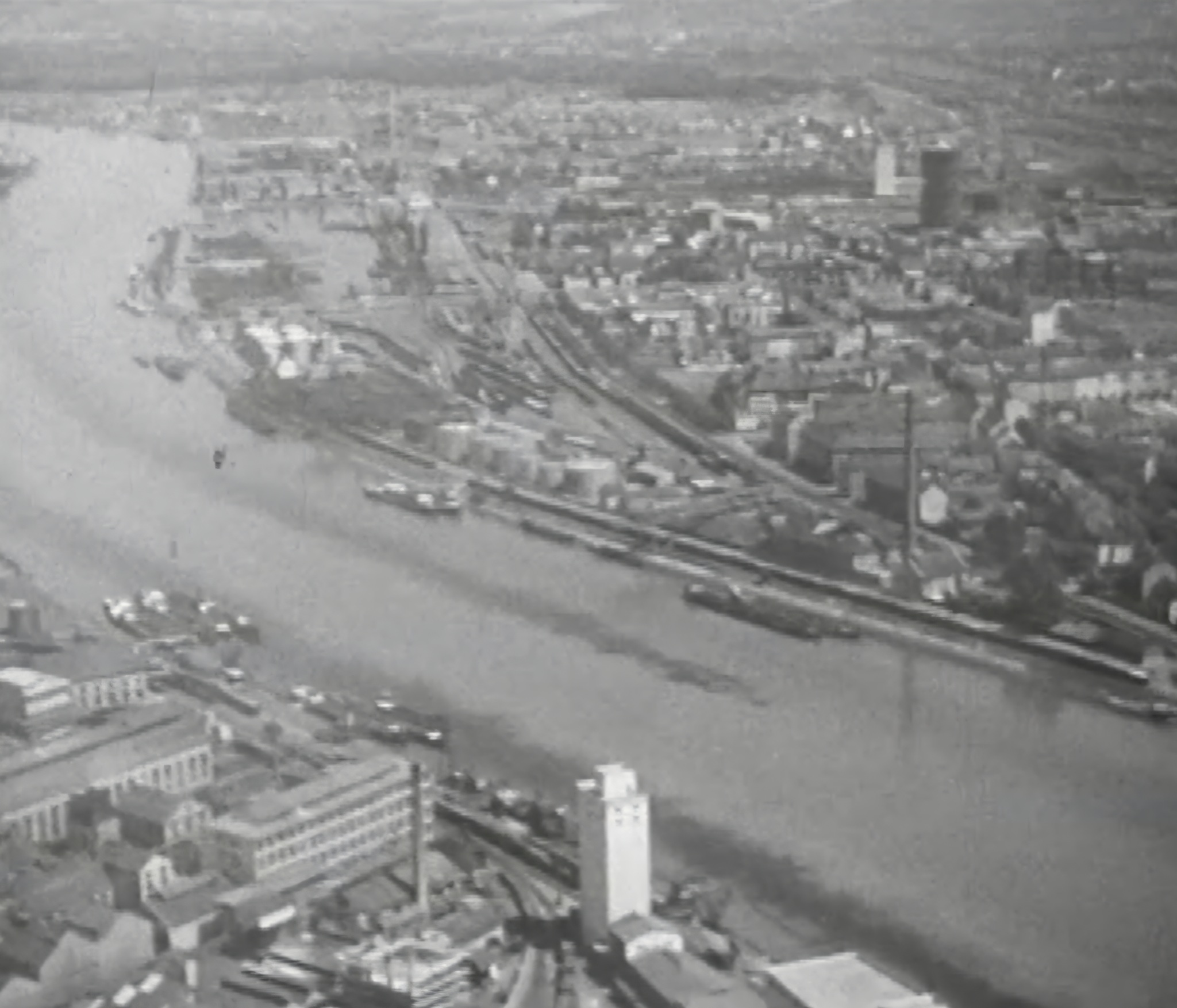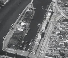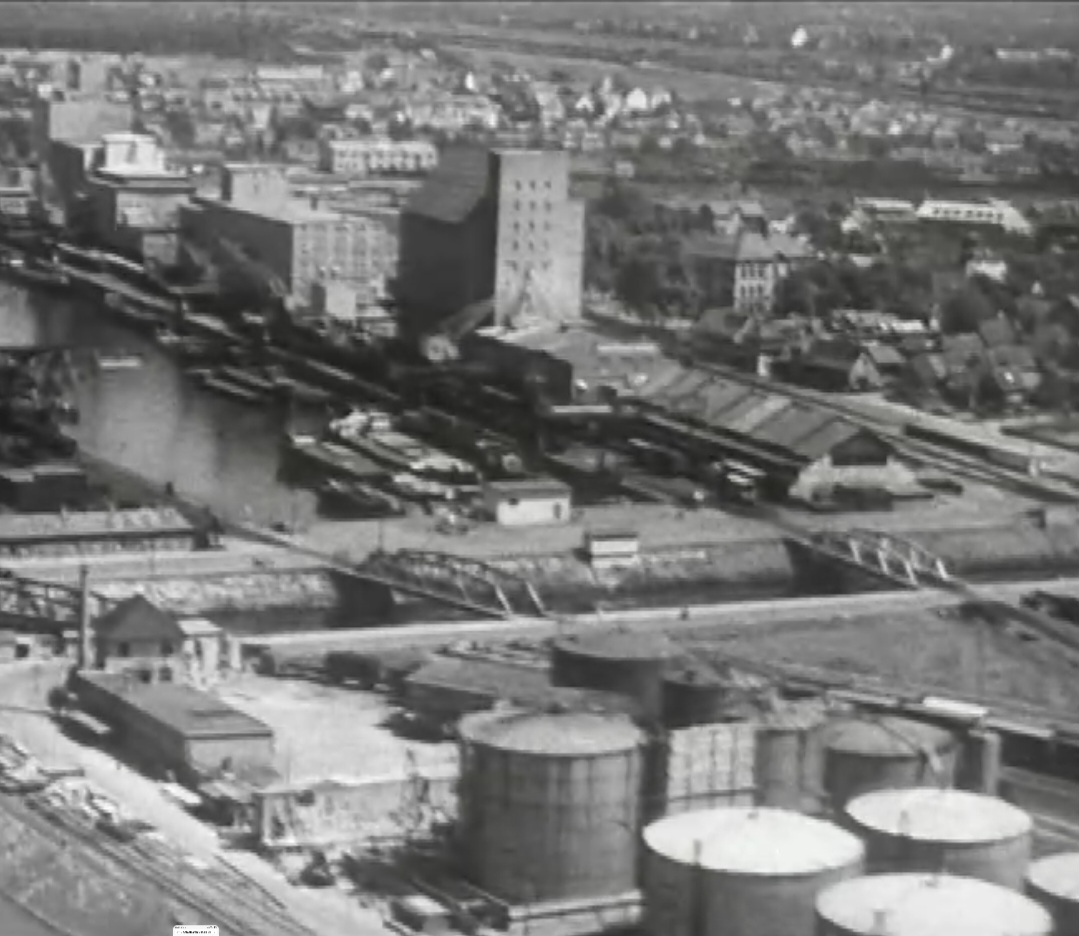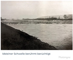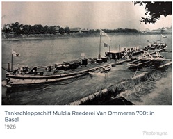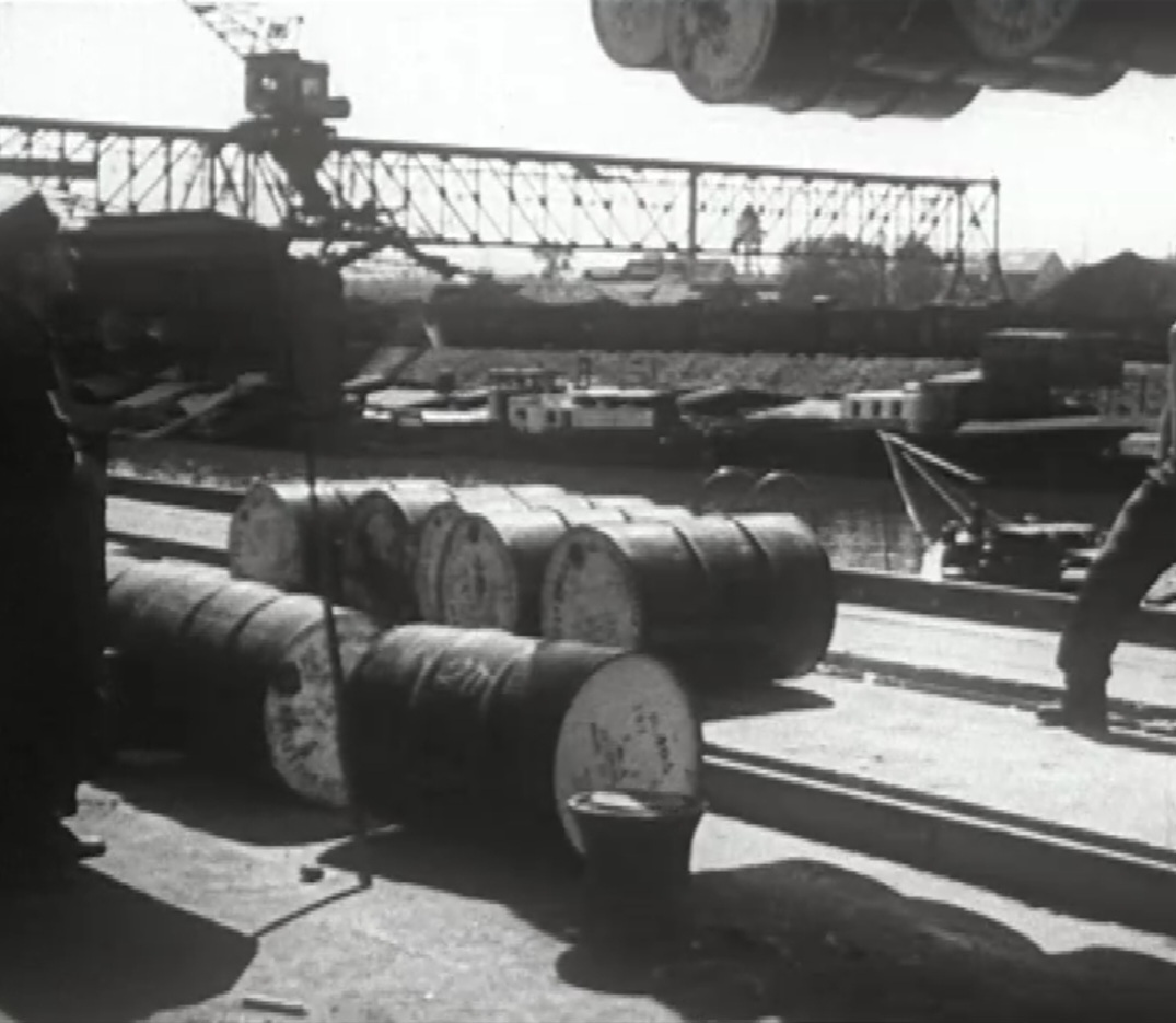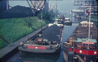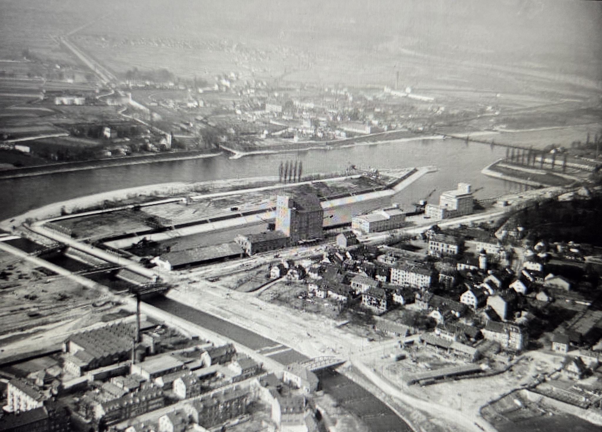 Bomben auf Kembs und der Rheinhafen ohne Wasser am 7. Oktober 1944: «Mehrere Staffeln englischer Bomber greifen das Stauwerk Kembs unterhalb Basels mit Sechstonnen-Bomben an. Eine grössere Anzahl Explosionen, zum Teil von Zeitbomben herrührend, erschüttern die Luft so sehr, dass an einigen Stellen Basels die Scheiben in Brüche gehen. Infolge der Sprengung von Schützen am Stauwehr fliesst ein Teil des gestauten Rheinwassers ab; in Basel fällt der Rheinpegel im Verlauf von drei Stunden um beinahe drei Meter, so dass die im Kleinhüninger Hafenbecken II liegenden Schiffe raschestens abgeschleppt werden müssen.» (Basler Chronik) Das Foto von Hans Bertolf zeigt die MS Nidwalden, die – mit 18 weiteren Schiffen – im Hafenbecken II auf Grund liegt. Als Folge der Kriegseinwirkungen wurde im Oktober 1944 die Rheinschifffahrt eingestellt und erst im April 1946 wieder aufgenommen. (Bildquelle: Staatsarchiv Basel-Stadt, BSL 1060c 3/2/511)Das Stauwerk ist für die Schifffahrt in Basel von grosser Bedeutung: «Die Stauwirkung reicht bis oberhalb des Stadtgebietes von Basel. In den Hafenanlagen wurde die Wassertiefe durch den Stau um etwa 3 bis 4 m erhöht. Die seit der Inbetriebnahme des Kraftwerkes Kembs 1933 neu erstellten Hafenanlagen wurden auf das Vorhandensein des Kembser Staues ausgerichtet.» Das Hafenbecken I, der Klybeckquai und der Industriehafen St. Johann konnten ihren Betrieb auch bei niedrigem Pegel aufrechterhalten.