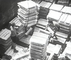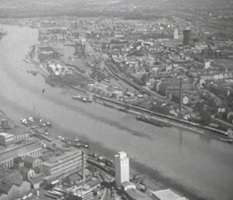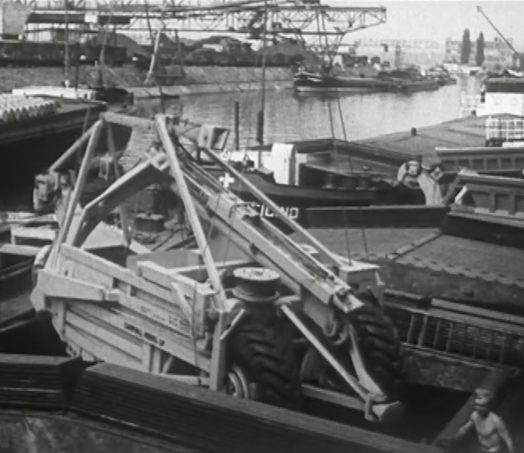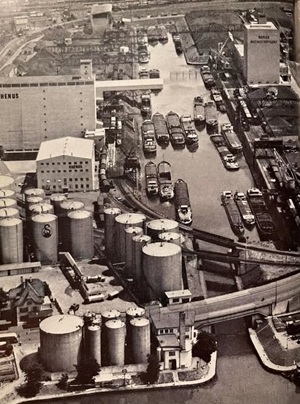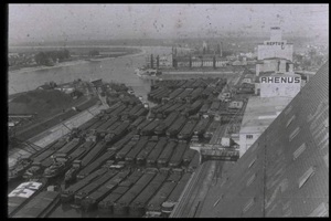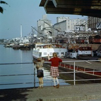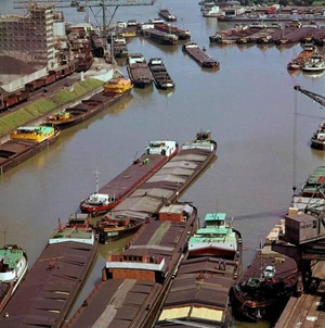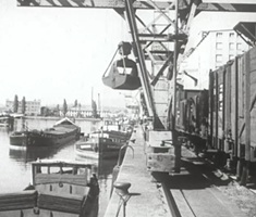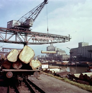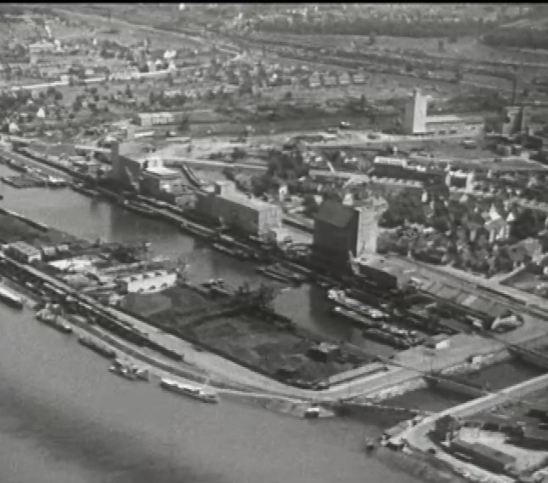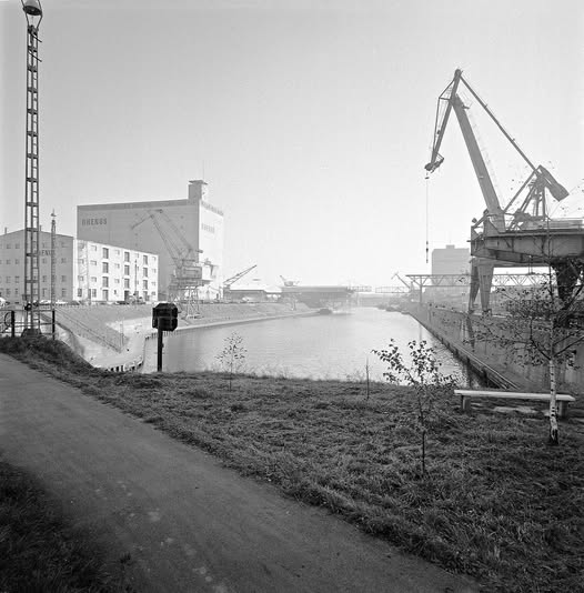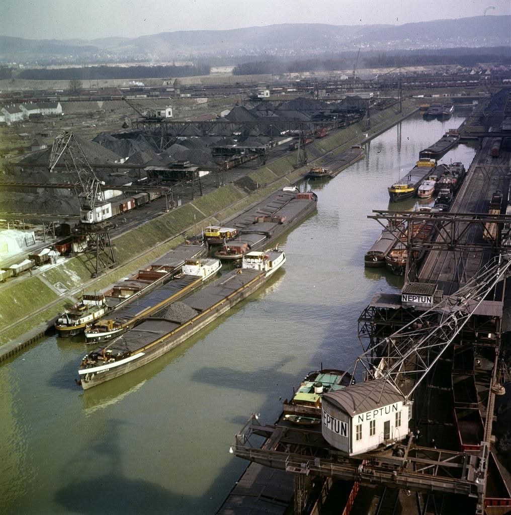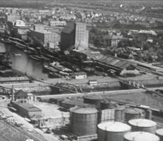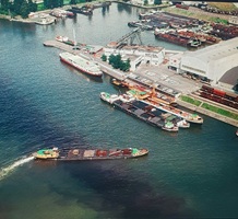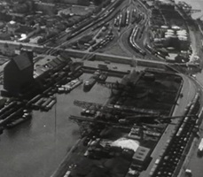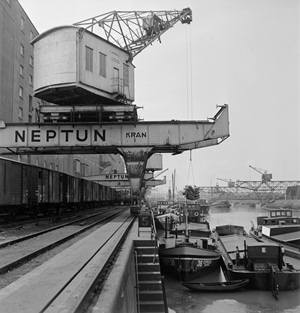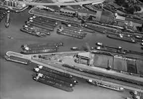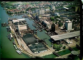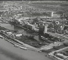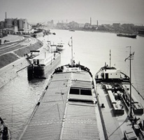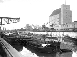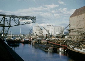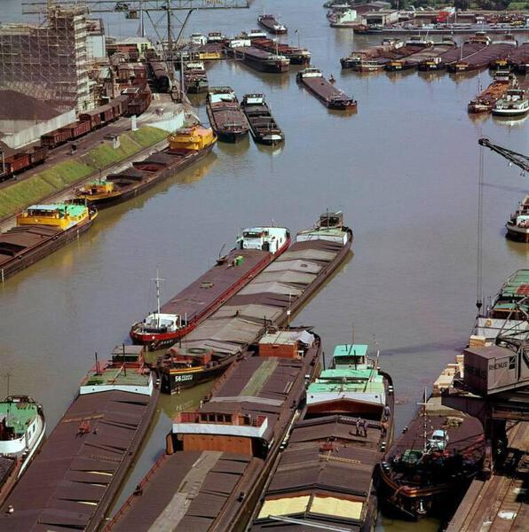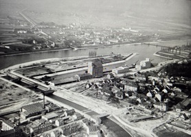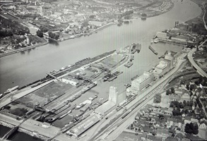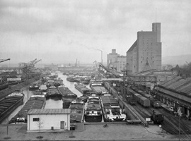 So präsentierte sich das Kleinhüninger Hafenbecken II am 29. Oktober 1975, rund 30 Jahre nach seiner Inbetriebnahme. Der erste Basler Rheinhafen war der 1911 eröffnete Industriehafen St. Johann. Die Planungen für die Hafenanlage in Kleinhüningen begannen 1914, ihr Initiator war der Ingenieur Rudolf Gelpke. 1922 nahm das erste Hafenbecken seinen Betrieb auf. Das zweite Hafenbecken wurde von 1936 bis 1939 im Rahmen des ‹Basler Arbeitsrappens› angelegt und nach dem Ende des Zweiten Weltkriegs offiziell eröffnet. Parallel dazu entstanden die Häfen in Birsfelden und Muttenz. (Bildquelle: Staatsarchiv Basel-Stadt, Foto: Hans Bertolf, BSL 1013 1-6981 1)