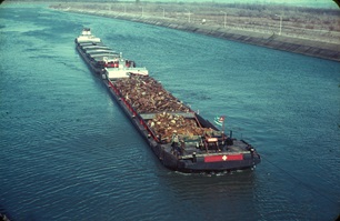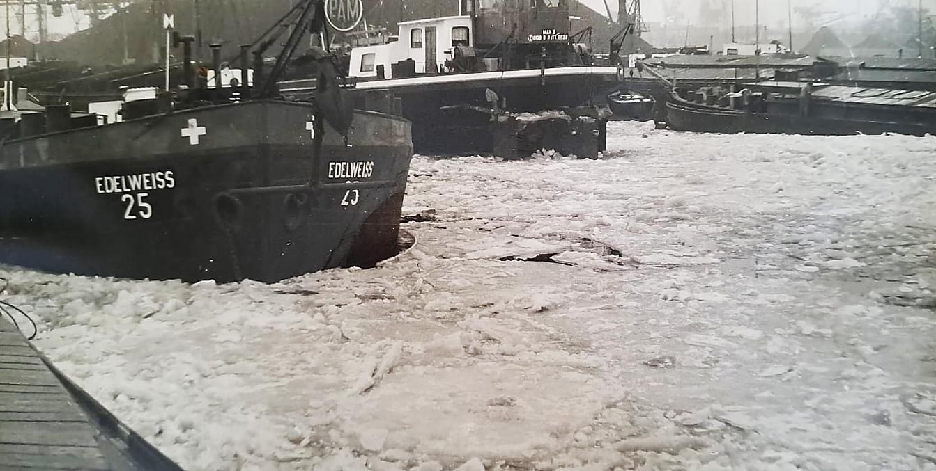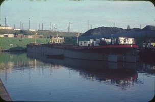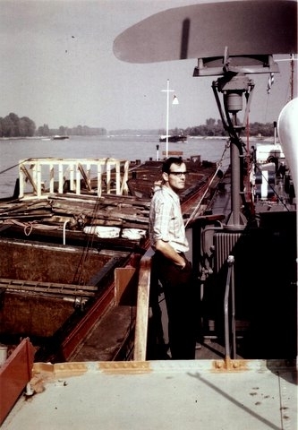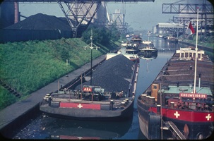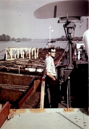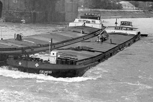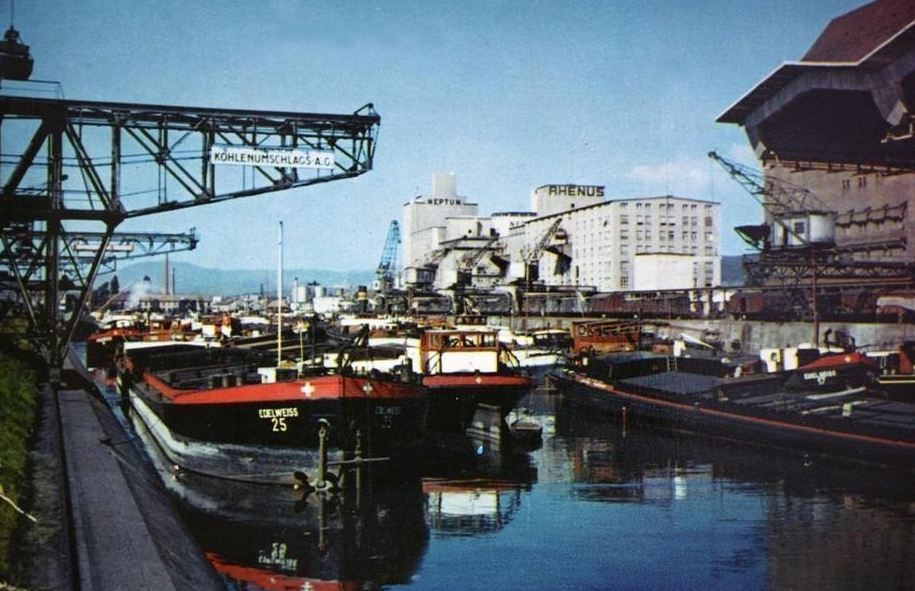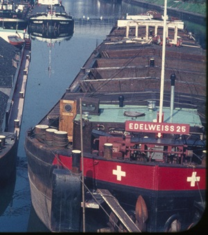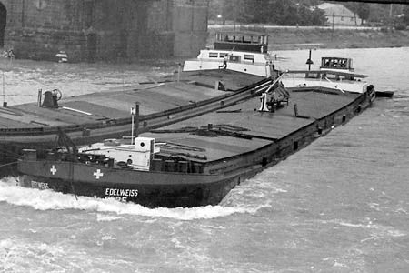 2 "Leberwürste" hinter der Boot Fatima 1965 auf der Bergfahrt bei Chalampé. Backbord Edelweiss21 mit Gemma, Steuerbord Edelweiss25 mit Columba. Woher ich das weiss? Von der Bildunterschrift. Fotograph war Peter Moeschlin, Basel. Die Wäscheaufhängende oder -abnehmede Frau, ist die Frau vom Schiffsführer Jan van Neijenhoff.